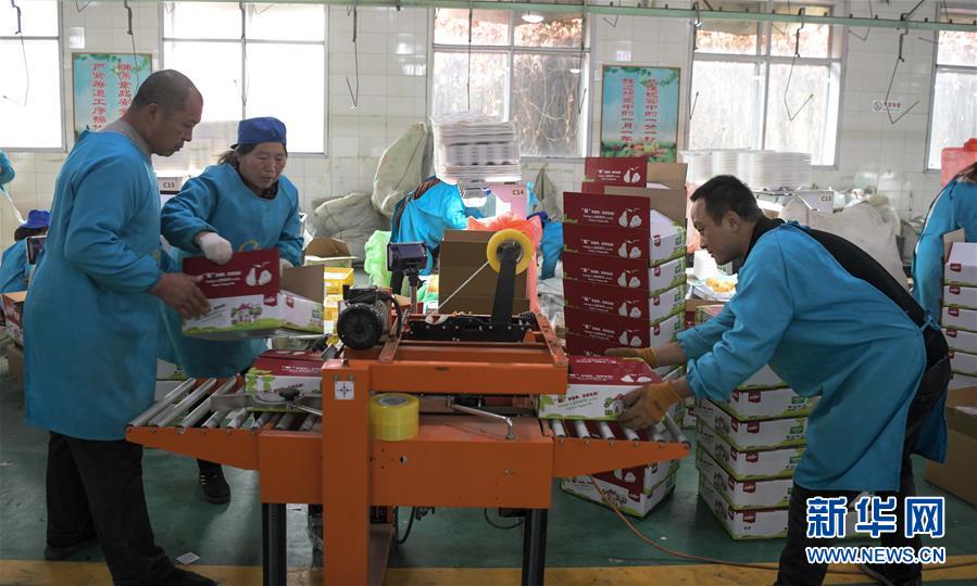 11月5日,在石家庄晋州市一家果品进出口企业的包装车间,工人将装箱完毕的梨果封装。 河北省石家庄晋州市梨果栽培历史悠久,现有梨树种植面积17万亩、鲜梨国际标准化出口示范基地11个。当地大力推广梨果无公害标准化生产,并发展梨果产业化经营,形成了规模化种植、标准化生产、商品化处理、品牌化销售格局。梨果产业成为当地农民致富增收的重要支柱产业。 新华社发(蒲东峰 摄)