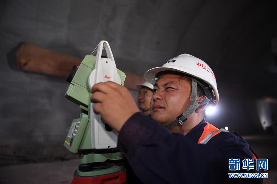 11月7日,工作人员在重庆首座下穿机场铁路隧道贯通面进行安全检查。 11月7日,由中铁二院勘察设计、中铁二十四局承建的重庆铁路枢纽东环线机场支线江北机场隧道顺利贯通。该隧道为单洞双线隧道,全长4490米,是重庆市首座下穿机场铁路隧道。 新华社记者 唐奕 摄