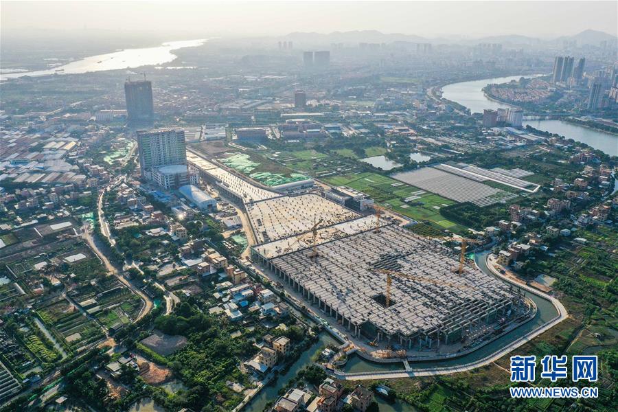 广州市地铁18号线陇枕停车场形似一把巨型吉他,横卧在珠江之畔(11月9日摄,无人机照片)。 日前,由中铁十一局承建的广州市地铁18号线陇枕停车场封顶在即。该停车场占地约21万平方米,形似一把巨型吉他,主要承担地铁车辆的停放、日常保养、列检及周月检任务。地铁18号连接广州市中心城区与南沙自贸区,设计最高时速160公里。 新华社记者 刘大伟 摄