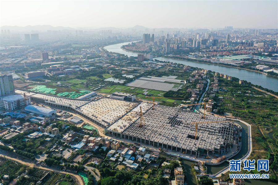 广州市地铁18号线陇枕停车场形似一把巨型吉他,横卧在珠江之畔(11月9日摄,无人机照片)。 日前,由中铁十一局承建的广州市地铁18号线陇枕停车场封顶在即。该停车场占地约21万平方米,形似一把巨型吉他,主要承担地铁车辆的停放、日常保养、列检及周月检任务。地铁18号连接广州市中心城区与南沙自贸区,设计最高时速160公里。 新华社记者 刘大伟 摄