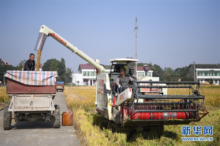 11月10日,湖南省益阳市赫山区八字哨镇农民将收获的稻谷装入车内。 当日,在湖南省益阳市赫山区八字哨镇,农民趁晴好天气,抢抓农时收获水稻。 新华社记者 薛宇舸 摄