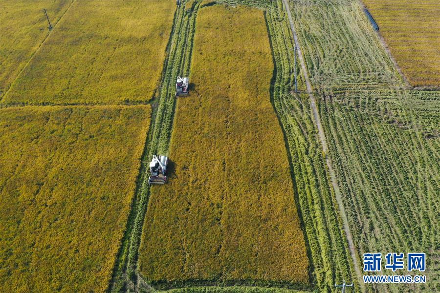 11月10日,湖南省益阳市赫山区八字哨镇农民驾驶收割机在田间收获水稻(无人机照片)。 当日,在湖南省益阳市赫山区八字哨镇,农民趁晴好天气,抢抓农时收获水稻。 新华社记者 薛宇舸 摄