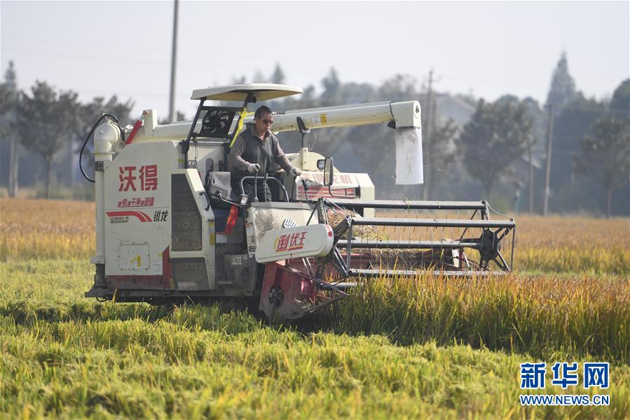 11月10日,湖南省益阳市赫山区八字哨镇农民驾驶收割机在田间收获水稻。 当日,在湖南省益阳市赫山区八字哨镇,农民趁晴好天气,抢抓农时收获水稻。 新华社记者 薛宇舸 摄
