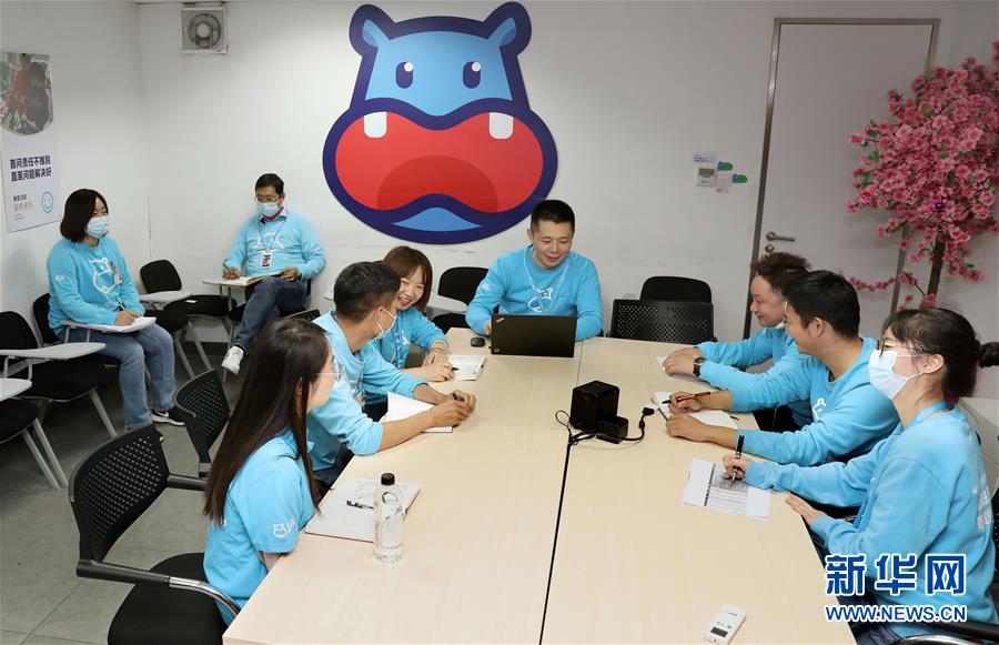 11月10日,王龙池(右四)主持业务会议,布置当日工作,与团队成员进行沟通。 新华社记者 刘颖 摄