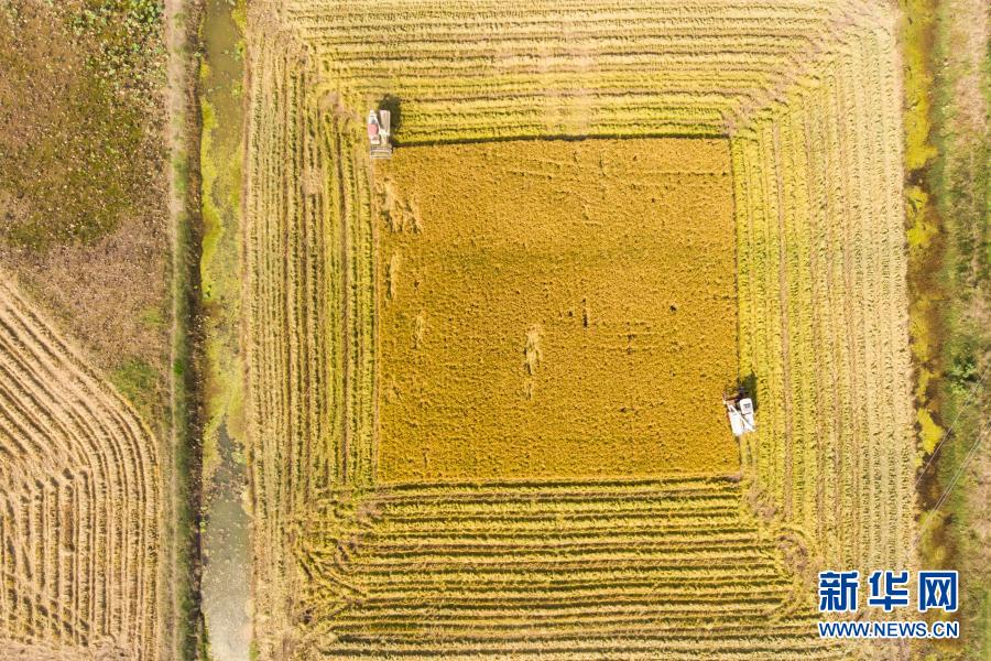 11月12日,在湖南省常德市安乡县安全乡,村民驾驶收割机收获水稻(无人机照片)。