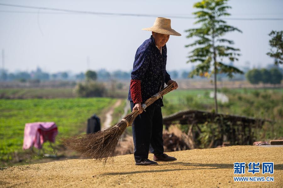 11月12日,在湖南省常德市安乡县安全乡,村民在翻晒稻谷。