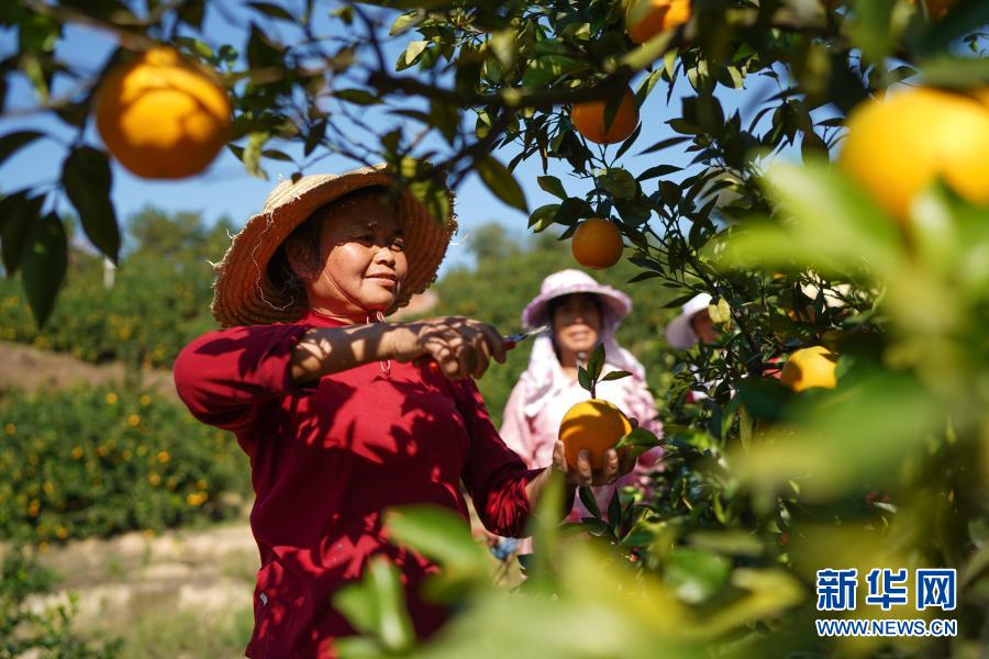 近日,江西省赣州市的脐橙进入采摘期,果园一派繁忙景象。据介绍,今年赣州市种植脐橙近170万亩,预计年产量超100万吨。
