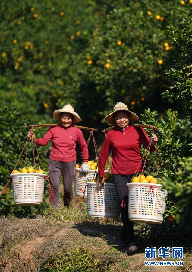 近日,江西省赣州市的脐橙进入采摘期,果园一派繁忙景象。据介绍,今年赣州市种植脐橙近170万亩,预计年产量超100万吨。