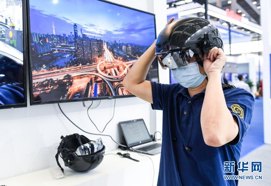 11月11日,光启展台的工作人员展示可以用于巡查发热人员的热成像智能头盔。
