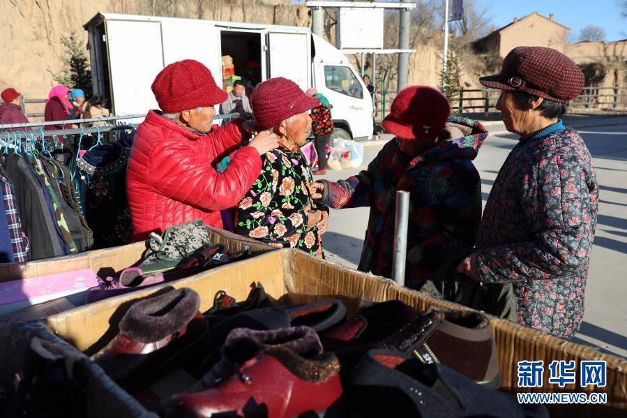 11月12日,老人在张家口市尚义县下马圈乡幸福互助院内挑选衣物。