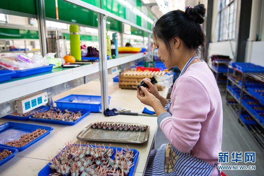 11月18日,在西安镇集镇安置区扶贫车间,工人在给电感器半成品点胶。新华社记者 陈思汗 摄