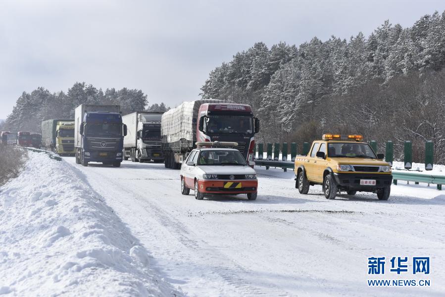 11月21日,在G11高速公路牡丹江市宁安段,路政车辆引导车辆有序通行 。