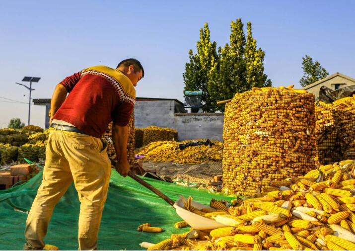 2020年10月7日,河北省邯郸市鸡泽县今年种植的18万亩玉米丰收,村民在田间地头、房前屋后晾晒玉米,遍地金黄。