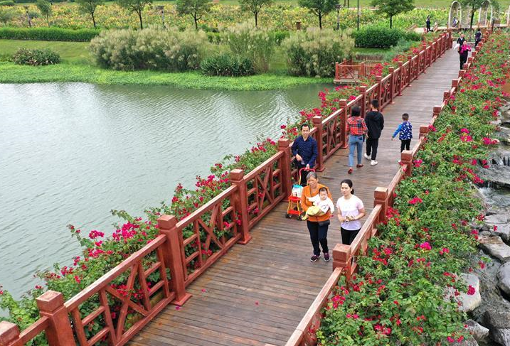金秋时节,广西南宁市那考河湿地公园草木葱茏、水碧花红,众多市民趁着假期到此游玩,尽享慢时光。
