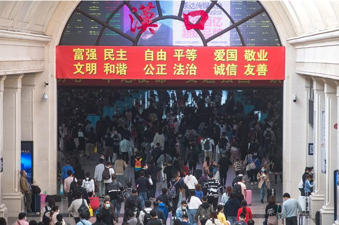 汉口火车站加强对进站旅客扫健康码、测体温、保持安全间距等防疫工作,加大站内消杀频次,保障旅客安全出行。