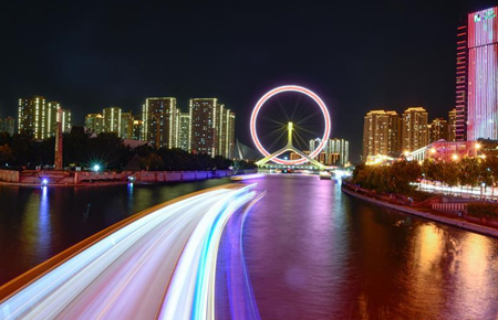 国庆、中秋“双节”期间,天津海河夜景灯光璀璨。