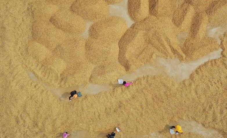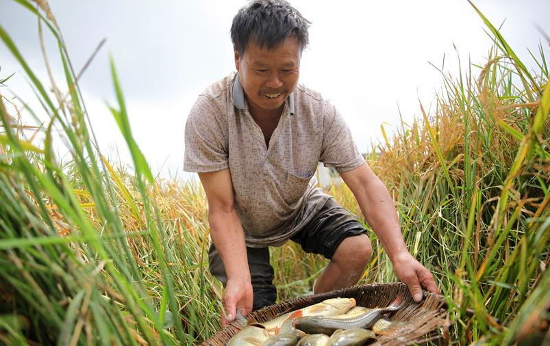 9月24日,贵州省毕节市黔西县洪水镇解放村村民抢收稻谷。 金秋时节,贵州省毕节市黔西县水稻进入收获季,村民抢收水稻的同时也捕捞稻田鱼。近