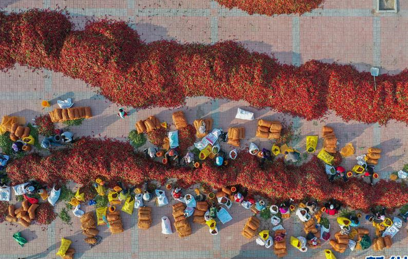 9月24日,农民在兴安盟突泉县突泉镇永宝村海波种植养殖专业合作社挑选辣椒(无人机照片)。 金秋时节,在内蒙古兴安盟突泉县,农民们忙碌在田间地头,一派丰收景象。