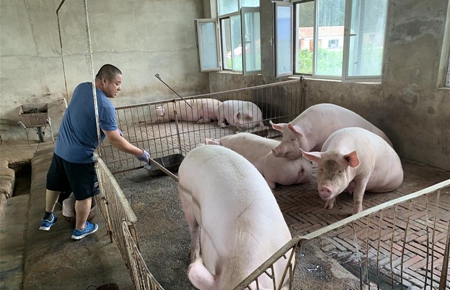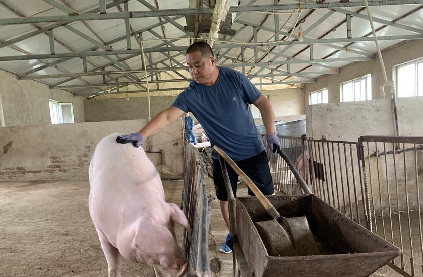 8月6日,内蒙古自治区兴安盟乌兰浩特市乌兰哈达镇白音特布斯格嘎查农民蒋鹏在自家猪圈里劳作。