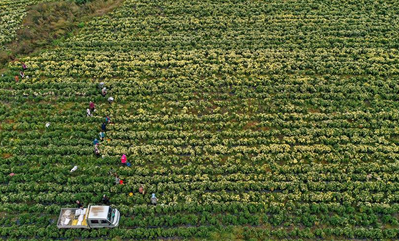 9月24日,农民在吉林省白山市靖宇县三道湖镇继红村采摘菊花(无人机照片)。 吉林省白山市靖宇县三道湖镇继红村地处长白山区,人均耕地面积少,农民多以种植玉米、大豆等传统作物为生。