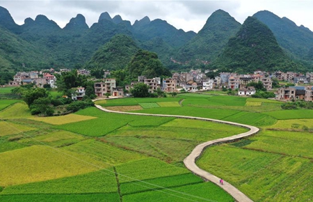 广西平乐县张家镇在稳定水稻播种面积的同时,积极推广优质高产水稻新品种。时下,正值该镇晚稻抽穗扬花时节,田园一派美丽景象。