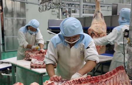 山东阳信:富民“牛产业”拉动“幸福车”,工人在阳信亿利源清真肉类有限公司内分割牛肉。