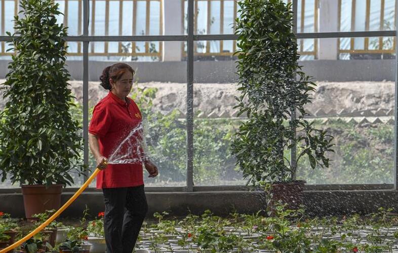 9月21日,在新疆喀什地区疏附县托克扎克镇阿亚格曼干村,村民麦尔耶姆古丽·麦提热伊木在由中国电信集团投资建设的花卉基地里浇水。