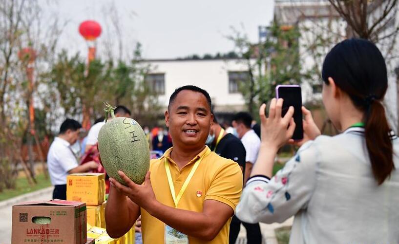 9月22日,在河南省开封市祥符区西姜寨村,瓜农在“晒丰收”活动现场展示兰考蜜瓜。 当日是2020年中国农民丰收节,河南省主会场活动在开封市祥符区西姜寨村举行。