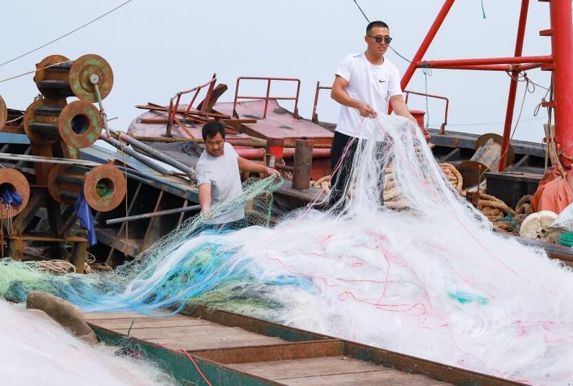 2020年9月14日,黄渤海伏季休渔期即将结束,江苏省连云港市赣榆区青口渔港码头,渔民正在整理网具、装运给养,准备出海秋捕。