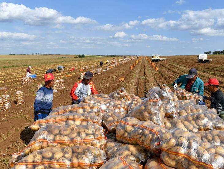 秋收时节,在内蒙古自治区呼和浩特市武川县上秃亥乡厂汉木台村的农田里,农民忙着收获土豆,一片热闹景象。