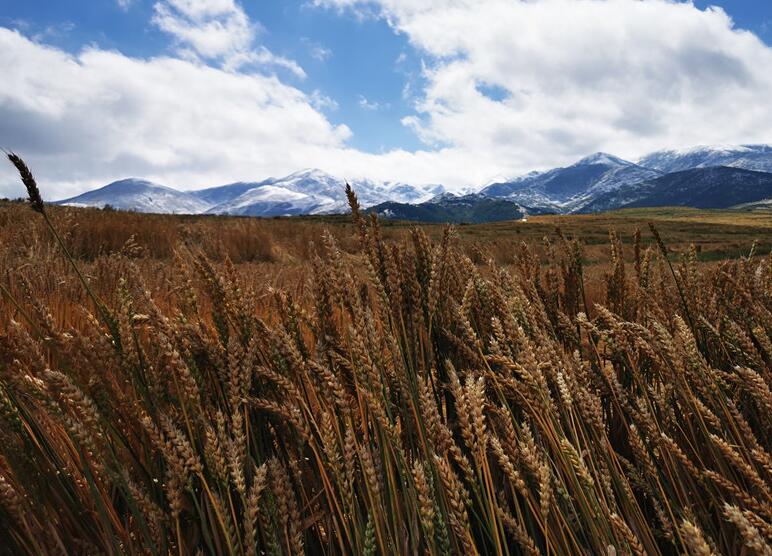 金秋时节,青海省西宁市大通回族土族自治县逊让乡八里村的梯田里,金黄色的麦穗在雪山的映衬下,分外灿烂。