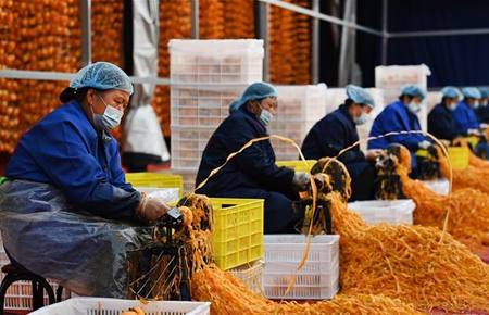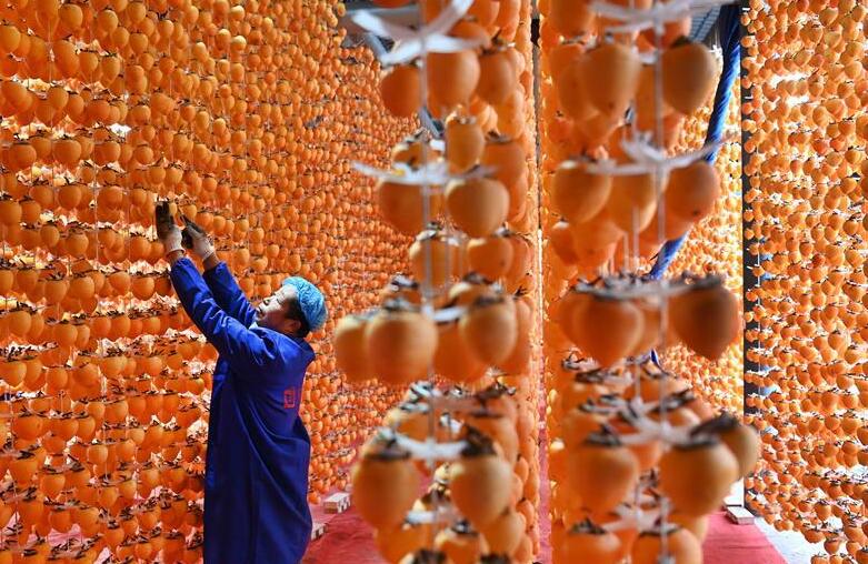 时下,陕西省渭南市富平县的柿子迎来丰收,当地群众抓紧时机加工杮饼。 近年来,富平县大力推动柿子产业发展,全县柿子种植总面积已达36万亩。柿子产业带动全县2400多户贫困户脱贫,成为当地群众致富增收的支柱产业。