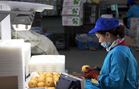 11月5日,在石家庄晋州市一家果品进出口企业的包装车间,工人在挑选、包装梨果。