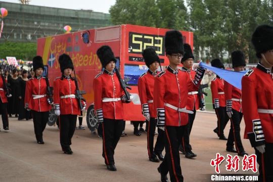 学生们身穿英国皇家护卫队服饰展现英国文化 张瑶 摄