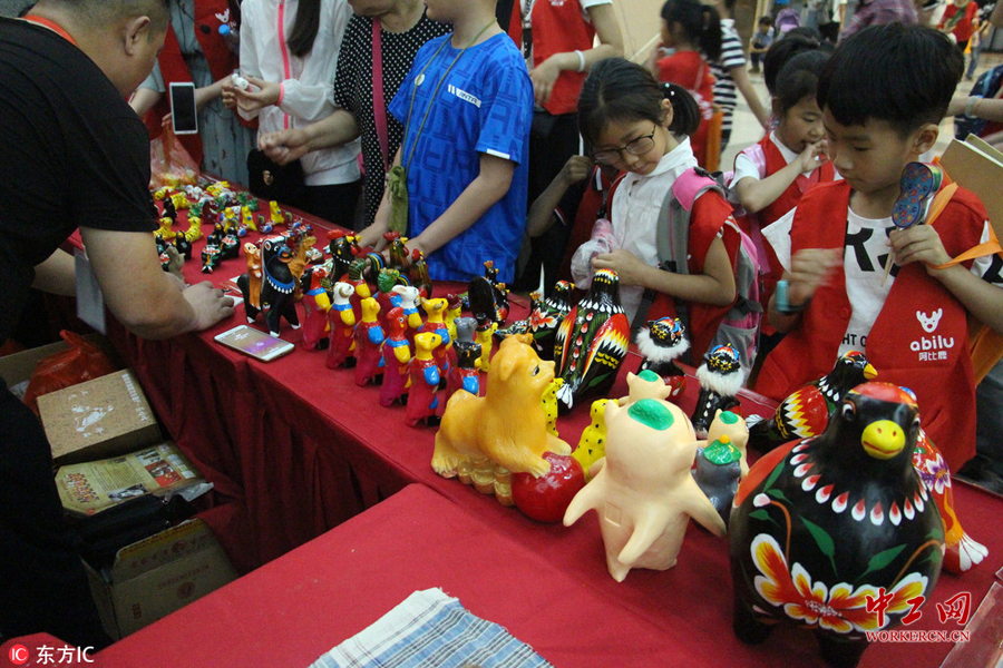 2018年6月2日,河南郑州,河南博物院“河南省传统工艺保护传承成果展”设置了互动展示活动,糖画项目手工艺人制作的“小猪佩奇”糖画被众多孩子追捧,供不应求。图为泥咕咕。 东方IC版权图片,请勿转载。