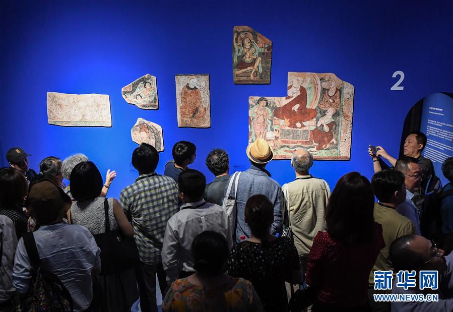 7月18日,观众欣赏新疆克孜尔石窟壁画复原展品。 当日,在新疆龟兹研究院等单位的共同努力下,流失海外的百余幅新疆克孜尔石窟壁画及洞窟复原影像在北京展出。此次展览还搭建还原了两个立体仿真洞窟,为观众提供较为完整的洞窟及壁画原貌的观赏体验。 克孜尔石窟位于新疆维吾尔自治区拜城县,始凿于公元3世纪,是我国开凿最早的大型石窟群之一。 新华社记者 李贺 摄