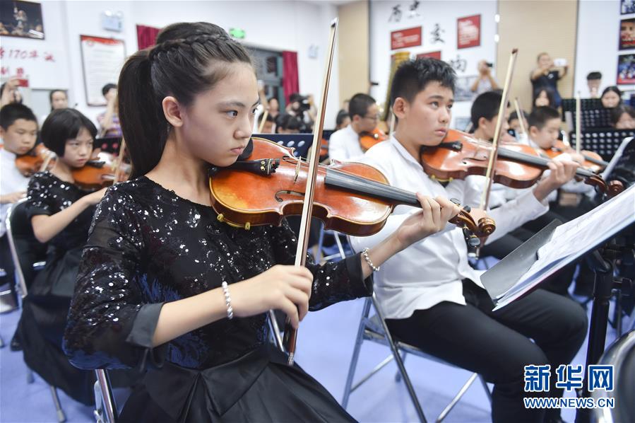 8月23日晚,在福建省福州市,小茉莉交响乐团成员在暑期集训上演奏。