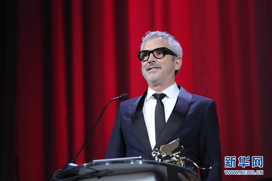 9月8日,在意大利威尼斯,墨西哥导演阿方索·卡隆在颁奖典礼上发言。他执导的影片《罗马》获得最佳影片金狮奖。