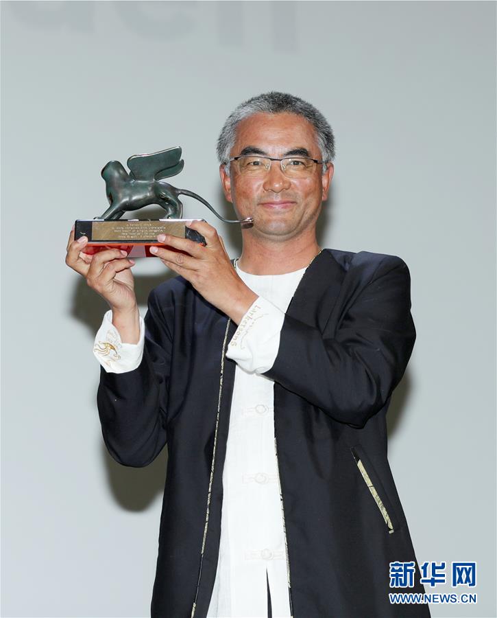 9月8日,在意大利威尼斯,中国导演万玛才旦展示奖杯。他执导的《撞死了一只羊》获得地平线单元最佳剧本奖。