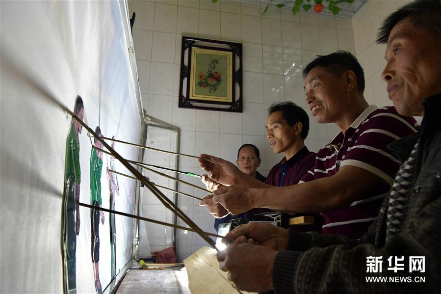 在江西省萍乡市湘东区东桥镇界头村,丁永发(右二)和剧团同事演出新编的皮影戏剧目《扶贫路上》(10月12日摄)。新华社记者 彭昭之 摄