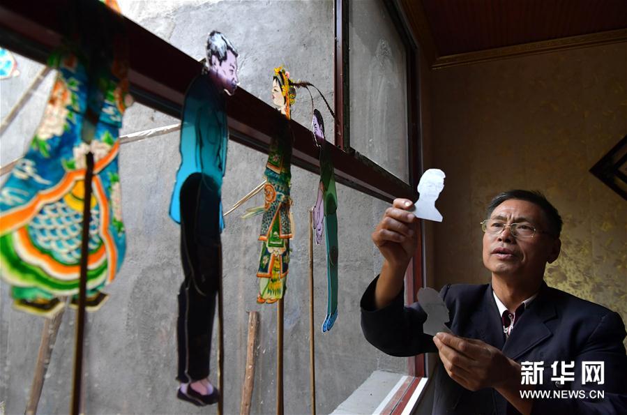 在江西省萍乡市湘东区东桥镇界头村,湘东皮影戏传承人丁永发查看新制作的几个人物形象(10月12日摄)。新华社记者 彭昭之 摄