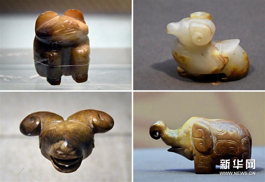 这是在河南安阳博物馆展出的妇好墓出土的玉器(拼版照片,10月12日摄)。 新华社记者李安摄