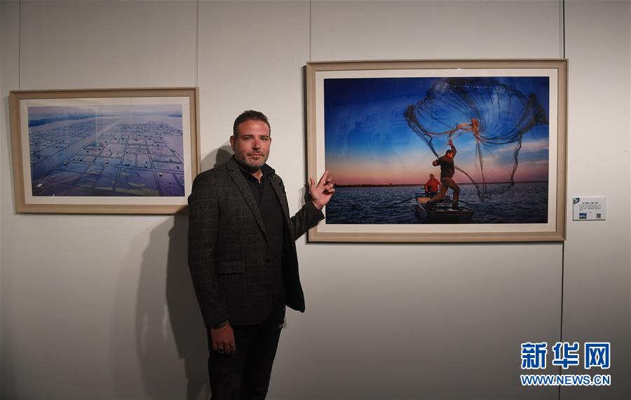 11月8日,一名国外摄影师在自己的作品前留影。 新华社记者 季春鹏 摄