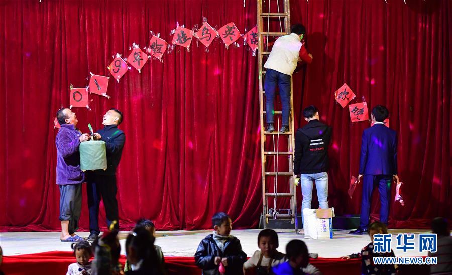 大年初三,乌英苗寨的年轻人在布置舞台,准备举办晚会(2月7日摄)。 新华社记者 黄孝邦 摄