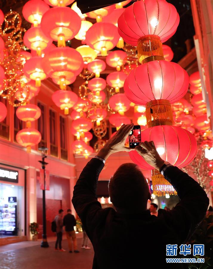 游客在香港街头游览(2月17日摄)。 除夕过,元宵近,香港街头多灯河。游客夜乐游,沉浸吉祥红。 新华社记者 吴晓初 摄