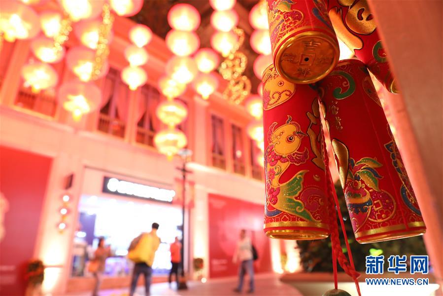 游客在香港街头游览(2月17日摄)。 除夕过,元宵近,香港街头多灯河。游客夜乐游,沉浸吉祥红。 新华社记者 吴晓初 摄