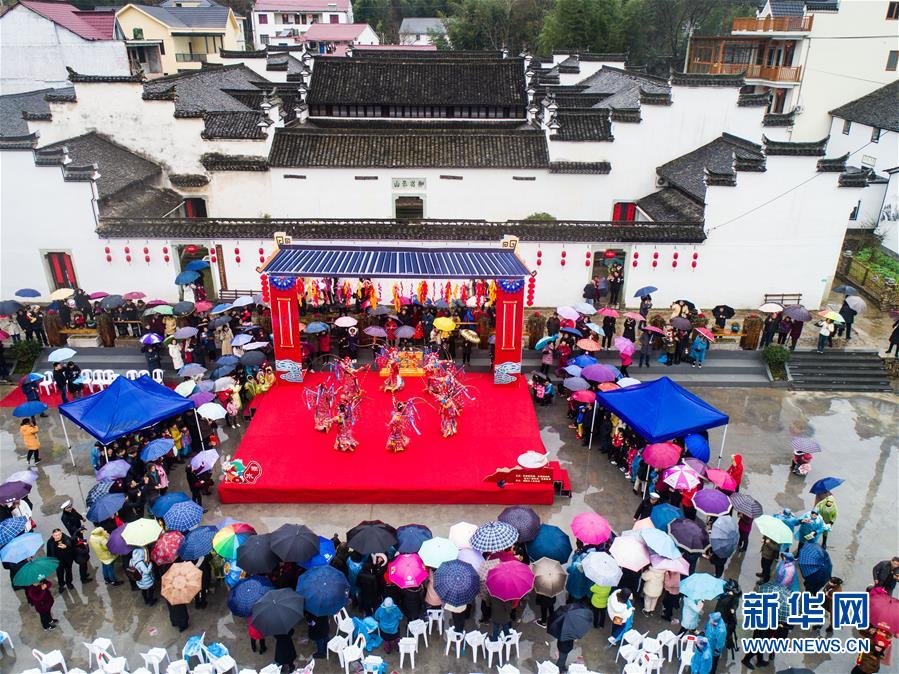 2月17日,村民们在观看传统戏剧表演(无人机拍摄)。 当日,浙江省杭州市富阳区湖源乡窈口村举办“别样元宵、年味乡愁”雨水节气活动,以年味和乡愁为主题,舞板龙唱大戏,展示国家级生态文化村窈口村的美丽乡村和独特的山水自然环境,在浓浓的传统山乡喜庆氛围中迎接元宵节。 窈口板龙源自清代,由当时走南闯北经商的村民从北方引进村内。长达130米的板龙由58张板凳连起来,板凳上有各种场景的灯笼装饰,近百名舞龙队员身穿传统服装,随着锣鼓的欢快节奏舞起龙灯,祈求新的一年风调雨顺。 新华社记者 徐昱 摄