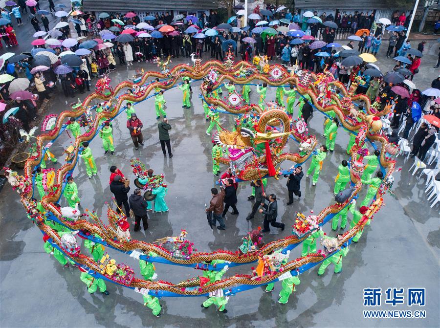 2月17日,乡村女子舞龙队队员抬着特色的板龙在窈口村的广场上进行表演(无人机拍摄)。 当日,浙江省杭州市富阳区湖源乡窈口村举办“别样元宵、年味乡愁”雨水节气活动,以年味和乡愁为主题,舞板龙唱大戏,展示国家级生态文化村窈口村的美丽乡村和独特的山水自然环境,在浓浓的传统山乡喜庆氛围中迎接元宵节。 窈口板龙源自清代,由当时走南闯北经商的村民从北方引进村内。长达130米的板龙由58张板凳连起来,板凳上有各种场景的灯笼装饰,近百名舞龙队员身穿传统服装,随着锣鼓的欢快节奏舞起龙灯,祈求新的一年风调雨顺。 新华社记者 徐昱 摄