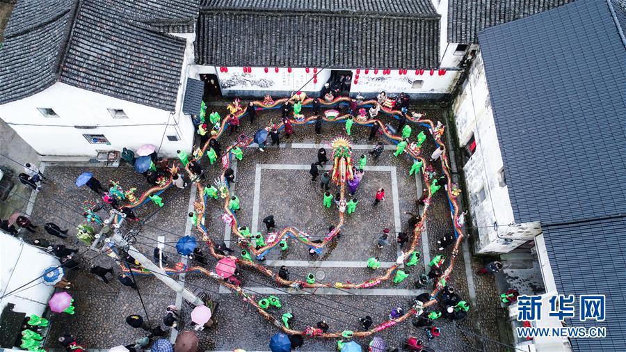 2月17日,乡村女子舞龙队队员抬着特色的板龙在窈口村中表演(无人机拍摄)。 当日,浙江省杭州市富阳区湖源乡窈口村举办“别样元宵、年味乡愁”雨水节气活动,以年味和乡愁为主题,舞板龙唱大戏,展示国家级生态文化村窈口村的美丽乡村和独特的山水自然环境,在浓浓的传统山乡喜庆氛围中迎接元宵节。 窈口板龙源自清代,由当时走南闯北经商的村民从北方引进村内。长达130米的板龙由58张板凳连起来,板凳上有各种场景的灯笼装饰,近百名舞龙队员身穿传统服装,随着锣鼓的欢快节奏舞起龙灯,祈求新的一年风调雨顺。 新华社记者 徐昱 摄