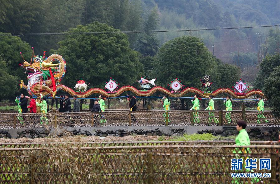 2月17日,乡村女子舞龙队队员抬着特色的板龙在窈口村的田野中行走。 当日,浙江省杭州市富阳区湖源乡窈口村举办“别样元宵、年味乡愁”雨水节气活动,以年味和乡愁为主题,舞板龙唱大戏,展示国家级生态文化村窈口村的美丽乡村和独特的山水自然环境,在浓浓的传统山乡喜庆氛围中迎接元宵节。 窈口板龙源自清代,由当时走南闯北经商的村民从北方引进村内。长达130米的板龙由58张板凳连起来,板凳上有各种场景的灯笼装饰,近百名舞龙队员身穿传统服装,随着锣鼓的欢快节奏舞起龙灯,祈求新的一年风调雨顺。 新华社记者 徐昱 摄